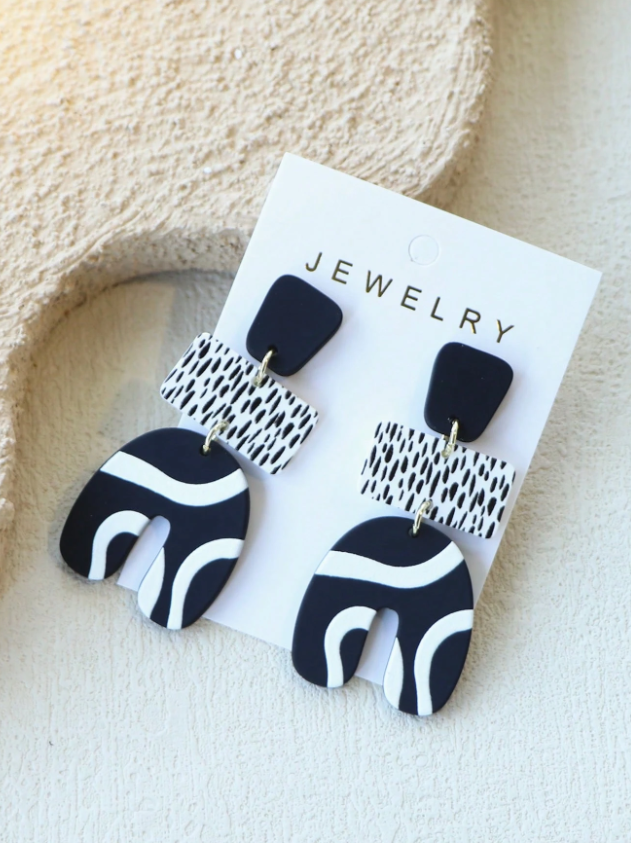 Make a statement with the Perfect Storm Earrings. Featuring bold black-and-white polka dots on a smooth clay-textured acrylic base, these earrings are the ultimate blend of playful pattern and striking sophistication.